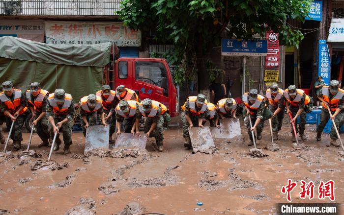 7月4日,萬州區五橋街道,武警官兵清理街道上的淤泥。 冉孟軍 攝