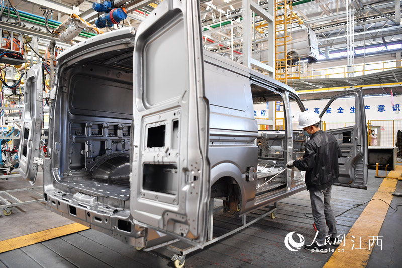 在江西省贛州市經開區的一家汽車生產企業的車間里,工人們正在作業。人民網 時雨攝