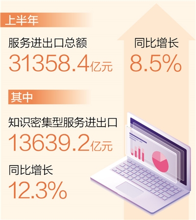 數據顯示,上半年知識密集型服務進出口13639.2億元,同比增長12.3%,占服務進出口總額的比重達43.5%,同比提升1.5個百分點。其中,知識密集型服務出口7923.4億元,增長16%;進口5715.8億元,增長7.5%。高附加值、高技術含量的知識密集型服務貿易實現較快增長、占比提升,說明我國服務出口競爭力明顯增強,正在向價值鏈高端攀升。