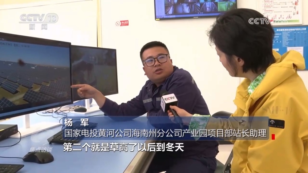 國家電投黃河公司海南州分公司產業園項目部站長助理楊軍:“光伏板下面這些羊,就是我們請過來幫忙除草的。因為每年一到夏天,園區電池組件下面草就特別高,長高了以后會遮擋電池組件,一個是影響發電效率,再一個秋冬季有火災隱患?!?/p>