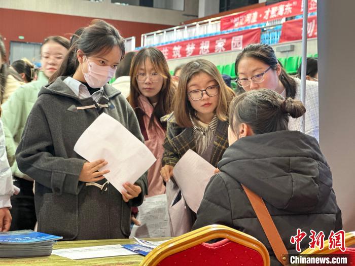 圖為招聘人員為大四畢業生介紹相關崗位信息。劉洋 攝