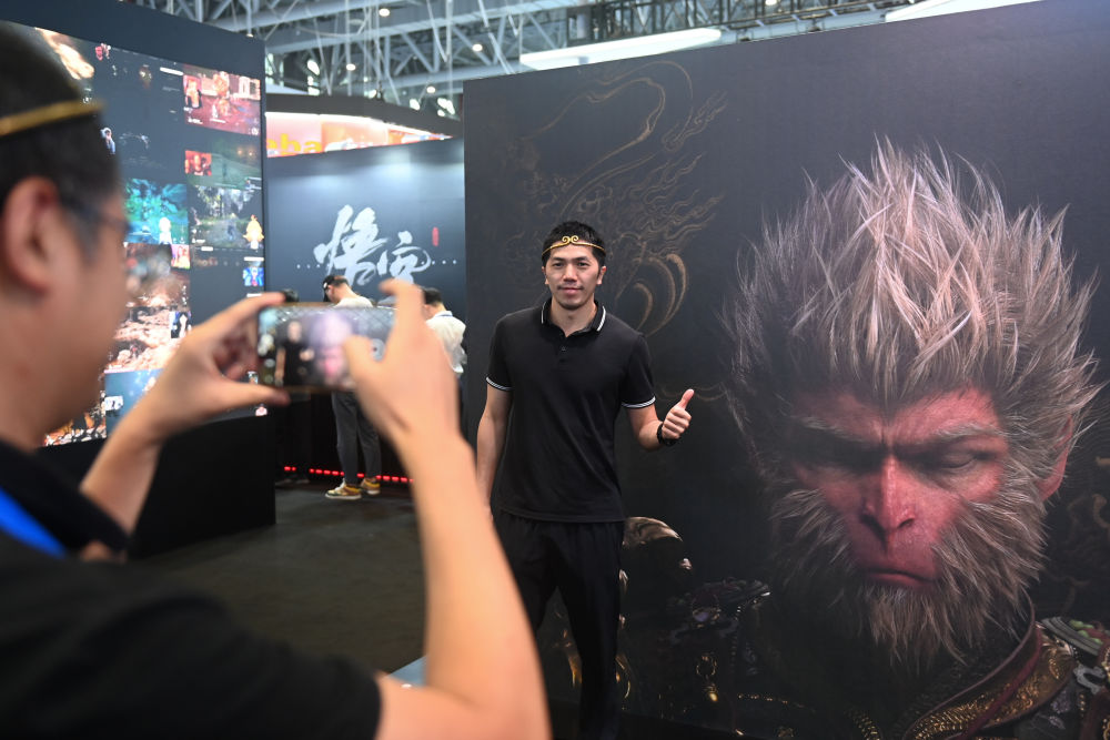 2024年9月25日,觀眾在第三屆全球數字貿易博覽會的游戲科學展區打卡。新華社記者 黃宗治 攝