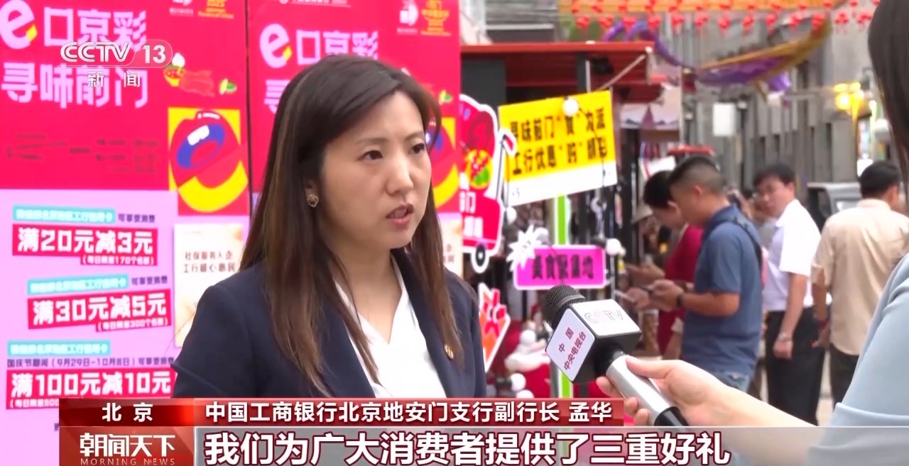 中國工商銀行北京地安門支行副行長 孟華:我們為廣大消費者提供了三重好禮,除了傳統的消費滿減活動以外,我們還疊加了數字人民幣的優惠支付,同時還設計了數字人民幣的打卡活動。