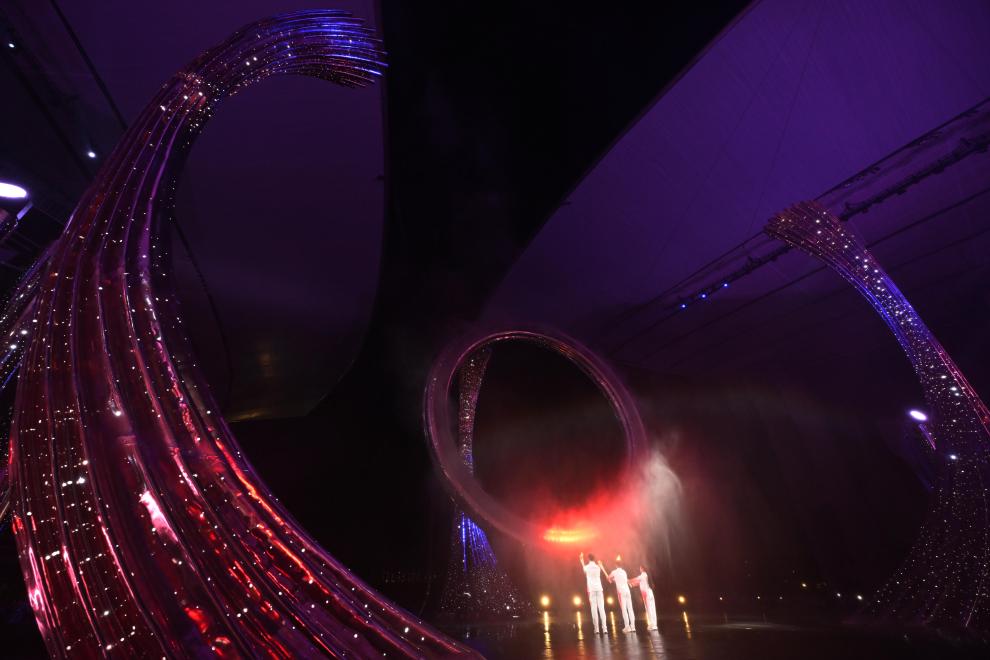 11月9日,火炬手蘇炳添(中)、張家朗(左)、李祎點燃主火炬。
