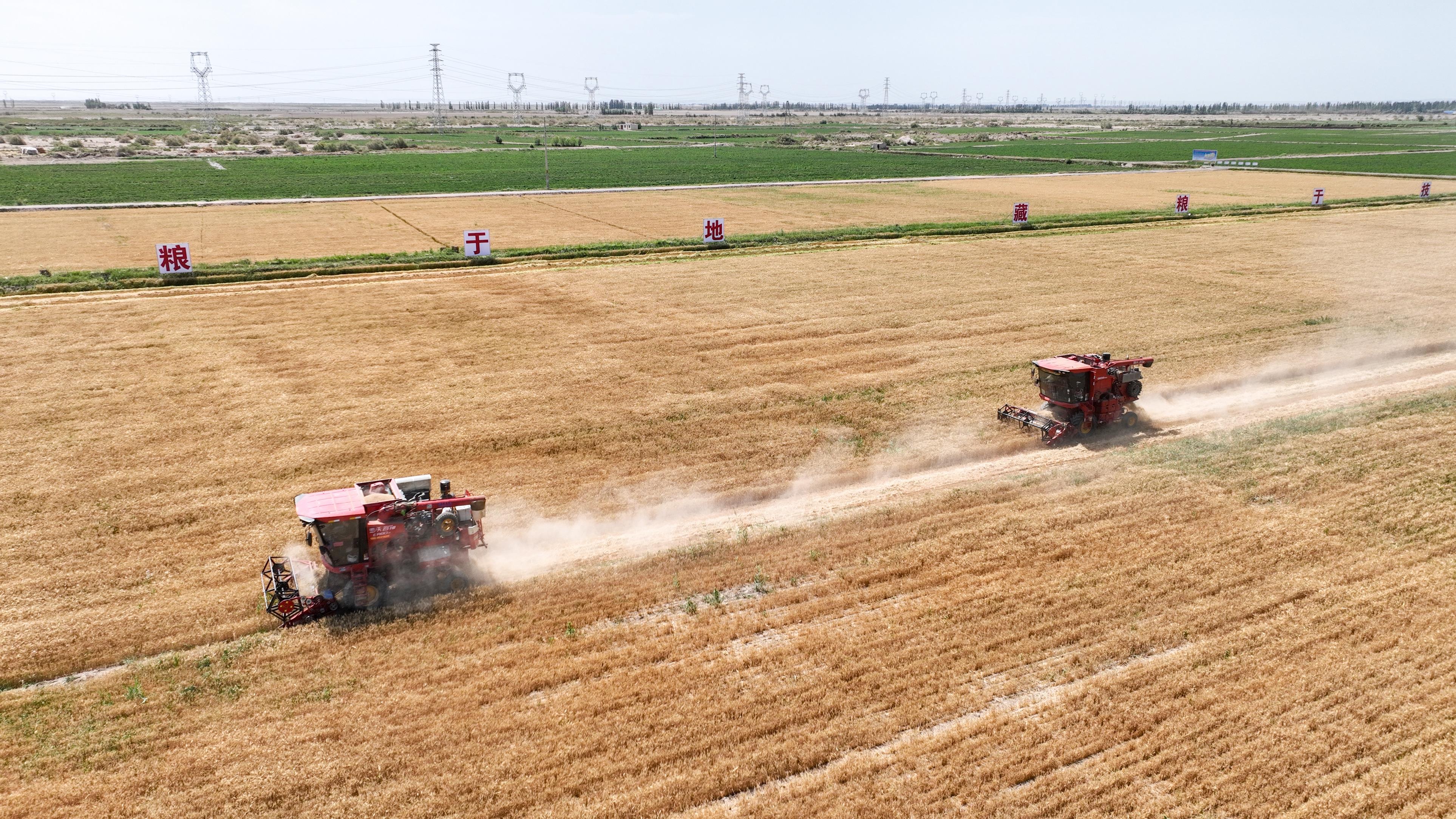 2024年7月10日,在甘肅省酒泉市金塔縣東壩鎮小河口村中度鹽堿耕地綜合治理利用示范點,1000余畝鹽堿地小麥喜獲豐收。