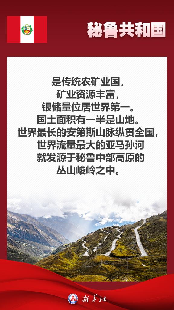 應秘魯共和國總統博魯阿爾特邀請,國家主席習近平將于11月13日至17日赴利馬出席亞太經合組織第三十一次領導人非正式會議并對秘魯進行國事訪問。秘魯位于南美洲西部,是印加文明發祥地,也是最早同新中國建交的拉美國家之一。關于秘魯,七張海報帶你了解更多——