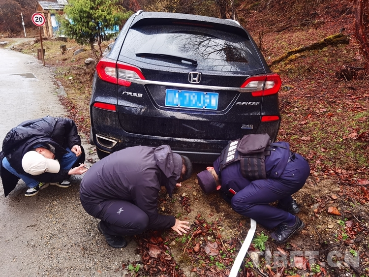 “我們來了,不用慌!”抵達現場后,移民管理警察向游客送上礦泉水,安撫游客情緒,隨后對現場進行拍照取證,并使用警車幫助車輛脫困。經過半個多小時的救援,車輛成功脫困,但由于受損嚴重,在警車護送下行駛2公里后無法繼續返回縣城。