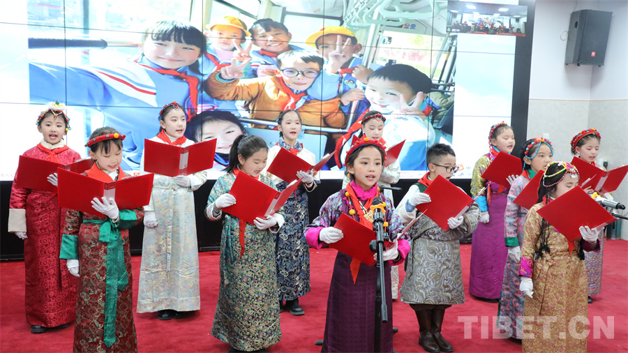 圖為拉薩市實驗小學和北京市海淀區中關村第二小學共同舉辦的“銘記歷史感黨恩 做新時代好少年”暨“西藏百萬農奴解放紀念日誦讀歌詠活動”