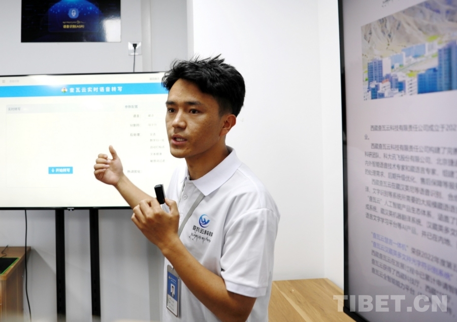 圖為西藏查瓦云科技有限責任公司副總經理次仁桑珠介紹查瓦云實時語音轉寫系統 攝影:劉莉