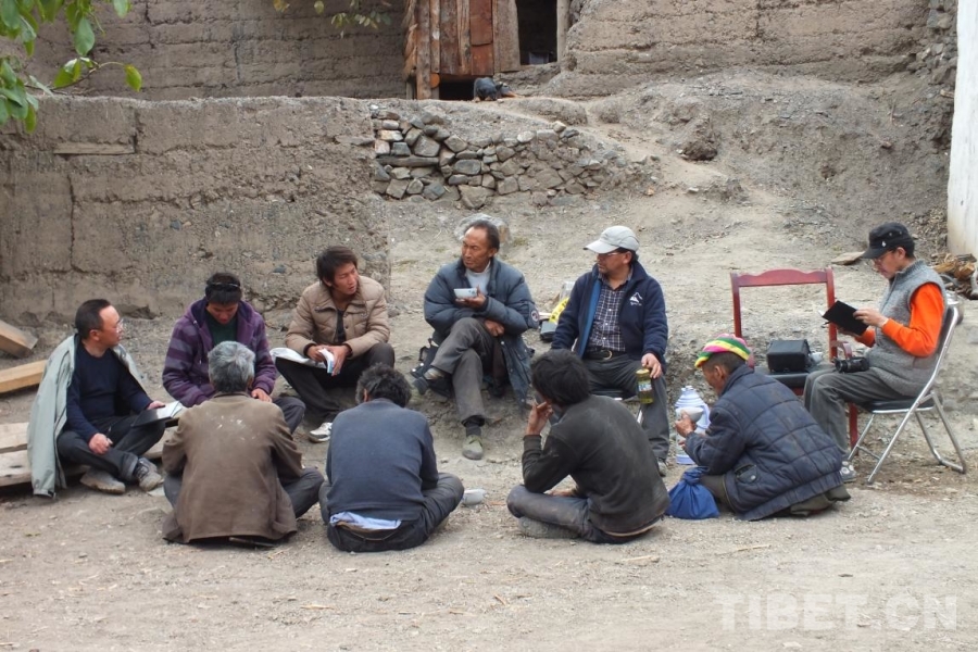圖為駐村期間,吉米平階(右一)正在和當(dāng)?shù)卮迕窠徽?/p>