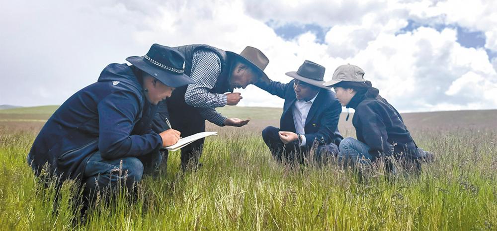 羅日蓋(左二)在達日縣特合土鄉夏曲村的萬畝草種基地查看草的長勢。咸文靜 攝