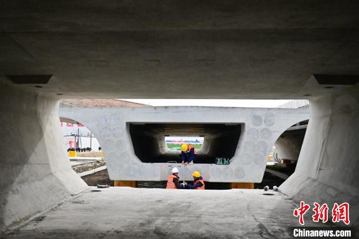 工程技術人員檢查首批已完成預制的箱梁。記者 劉忠俊 攝