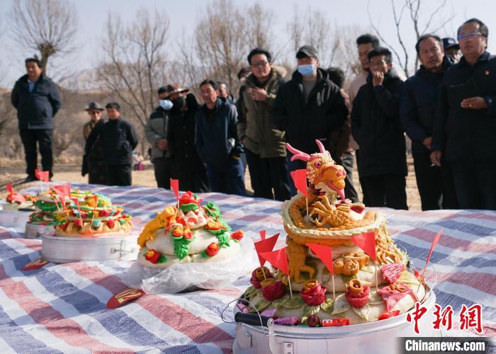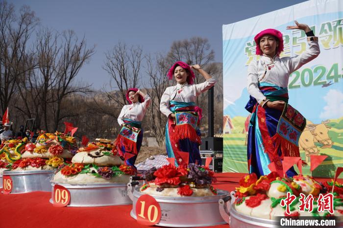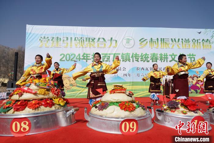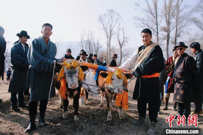 3月6日,青海省海南藏族自治州貴德縣拉西瓦鎮舉辦春耕文化節活動。該鎮十個村的村民身穿節日盛裝,手捧制作精美、色彩鮮艷,寓意風調雨順、五谷豐登的“彤糕”來到田間,以“二牛抬杠”的傳統方式開啟今春“第一犁”。