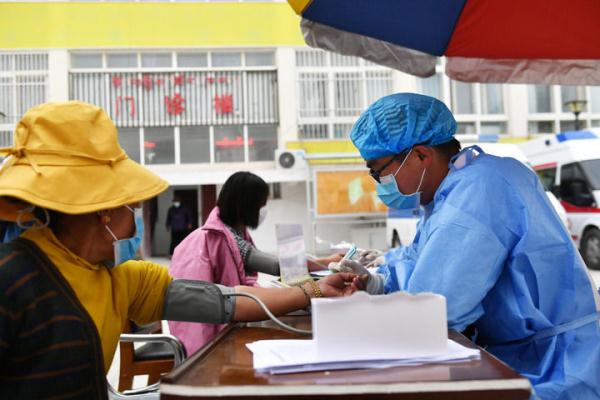 5月18日,醫務人員在為準備接種新冠疫苗的居民測量血壓。新華社記者 孫瑞博 攝
